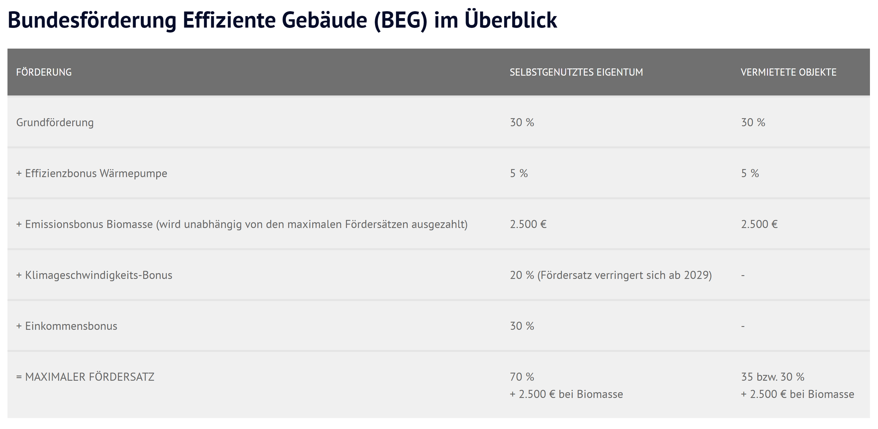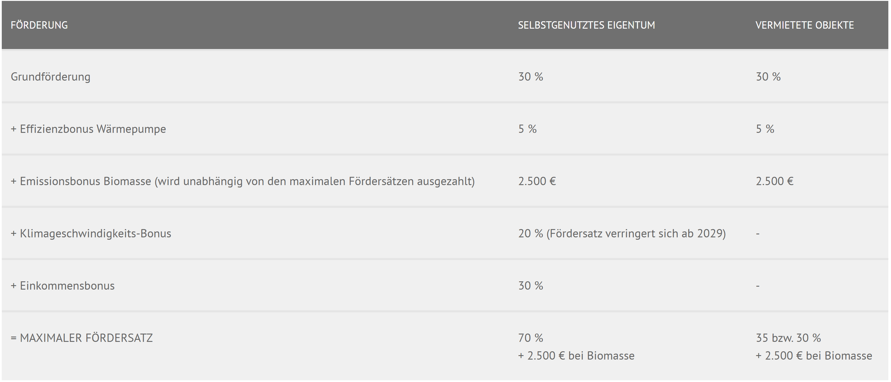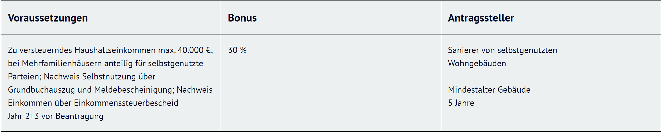 Die anrechenbaren förderfähigen Investitionskosten sind bei Wohngebäuden auf 30.000 Euro für die erste Wohneinheit, 15.000 Euro für die zweite bis sechste und 8.000 Euro ab der siebten Wohneinheit begrenzt. Bei Nichtwohngebäuden ergeben sich die anrechnungsfähigen Kosten aus der beheizten „Netto-Grundfläche“ (NGF):