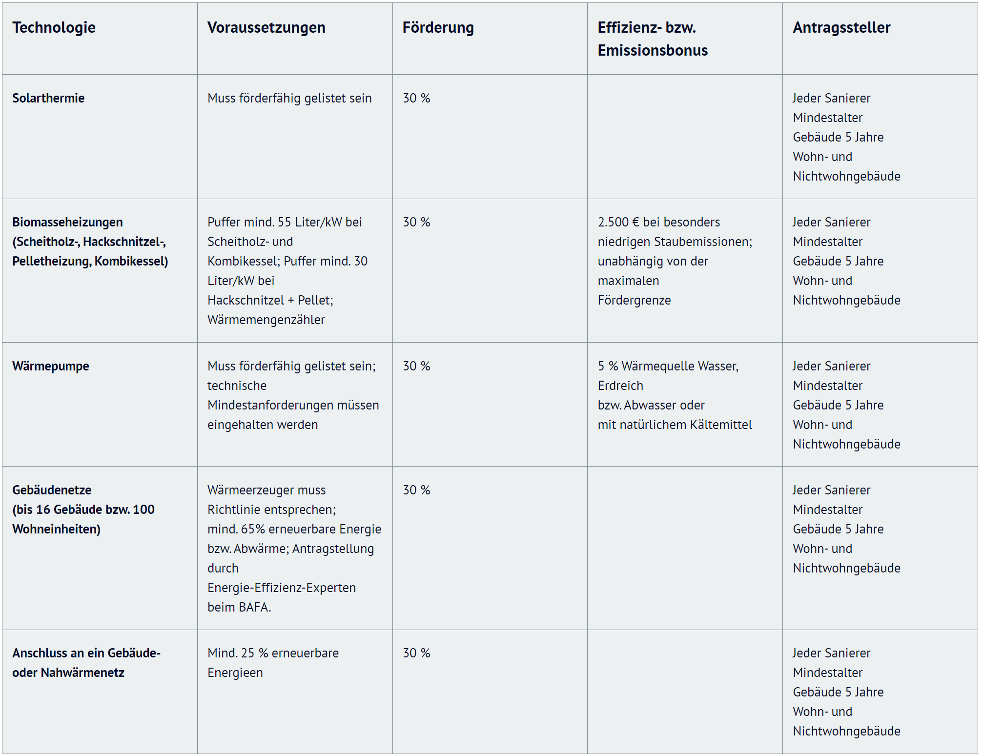 Die Zuschüsse für den Heizungstausch (wie bspw. Biomasseheizungen, Wärmepumpen oder solarthermische Anlagen) können künftig nur noch bei der KfW beantragt werden. Informationen finden Sie unter www.kfw.de. Anträge für die Errichtung, Erweiterung und den Umbau von Gebäudenetzen können seit 1. Januar 2024 beim BAFA gestellt werden.